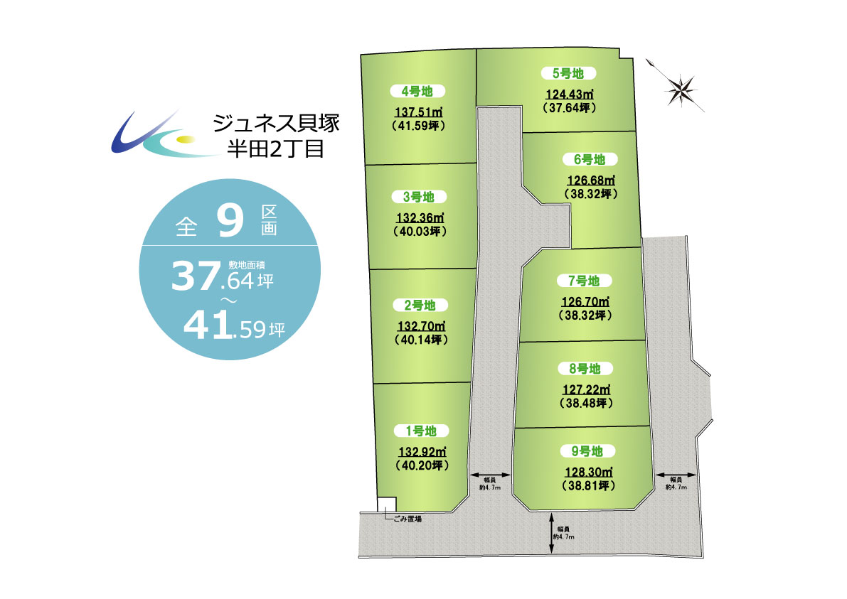 | 土地面積 | 124.43㎡(37.64坪)~132.92㎡(40.20坪) | 私道負担 | |