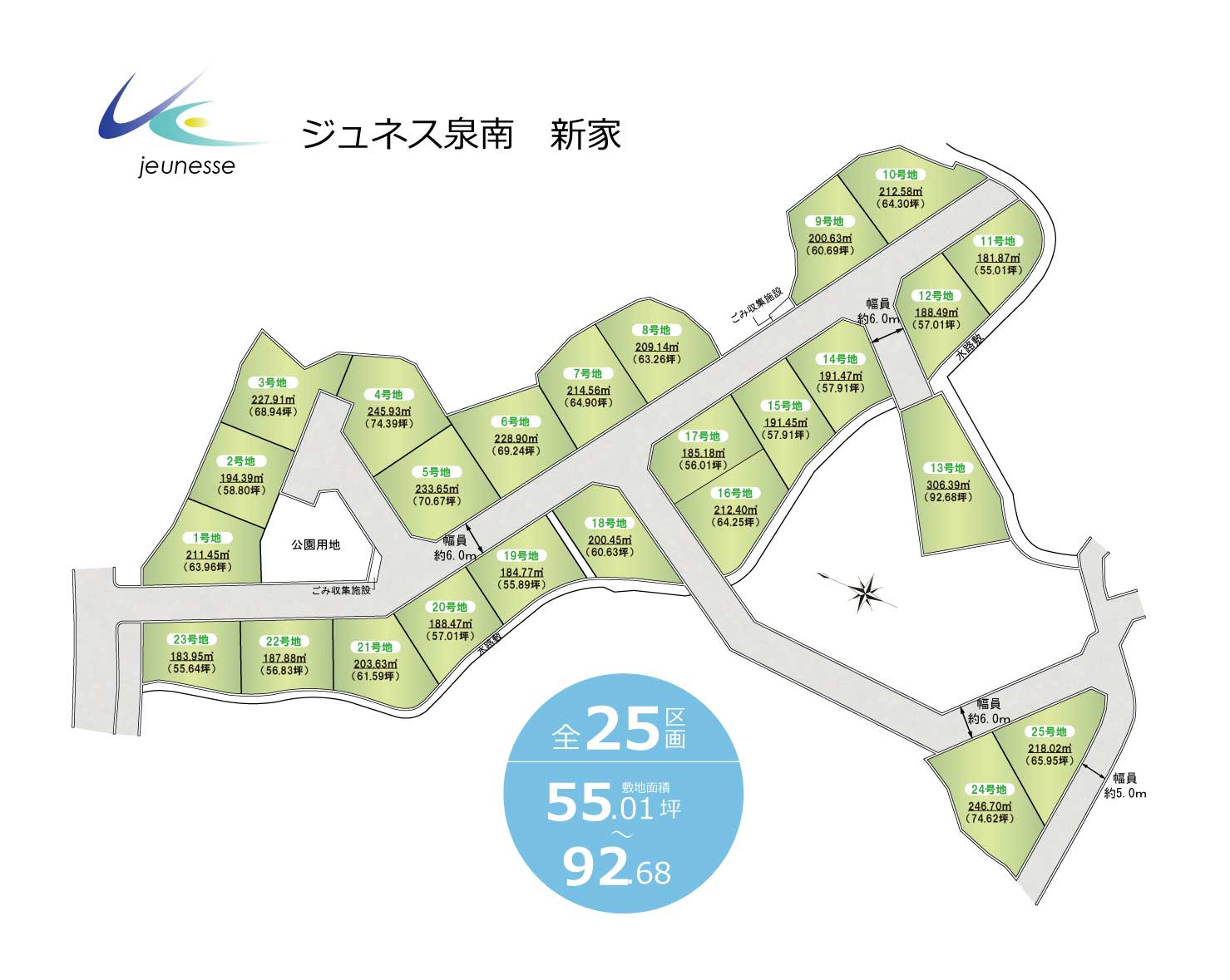 | 土地面積 | 181.87㎡(55.01坪)~306.39㎡(92.68坪) | 私道負担 | |