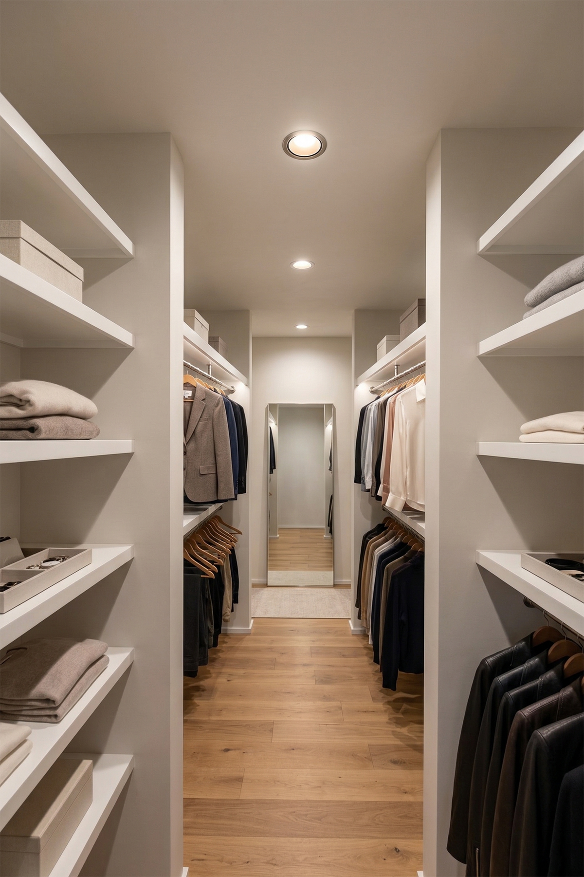 ファミリークローゼットは入口が2か所。脱衣室で洗って干して、そのままクローゼットへしまえる。朝の身支度も、洗濯の流れも、一本の動線でつながっています。
