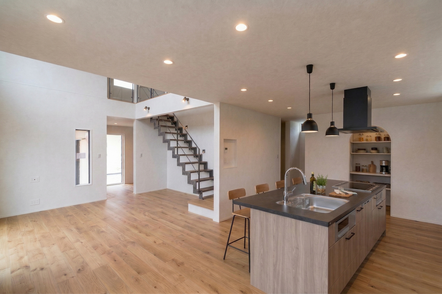 階段をあえて間取りの中心へ。その結果、LDK全体に自然な広がりが生まれました。アイランドキッチンからはリビングが一望でき料理をしながら家族と話せる。吹き抜けの開放感も相まって、家族が自然と集まる空間になっています。